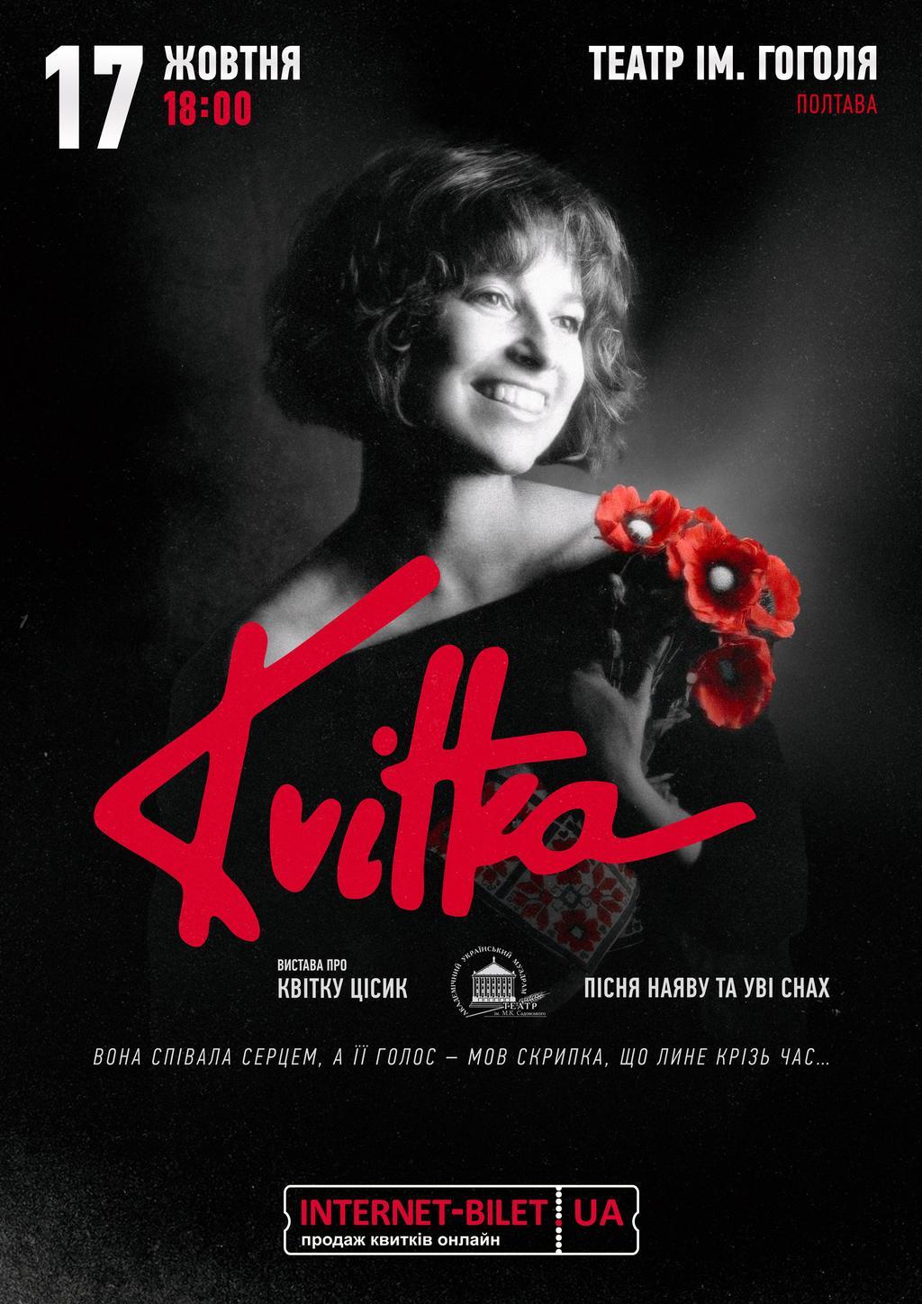 17 жовтня у Полтаві о 18.00 у театрі ім. Гоголя не пропустіть показ виняткової вистави «KVITKA», що стала світовою прем’єрою — першою у світі постановкою про кохання і долю славетної американської співачки з українським серцем.
