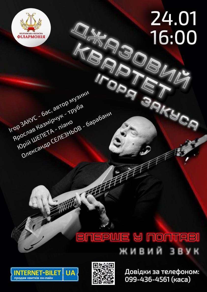 16.00 – Джазовий квартет Ігоря Закуса в Полтавській обласній філармонії