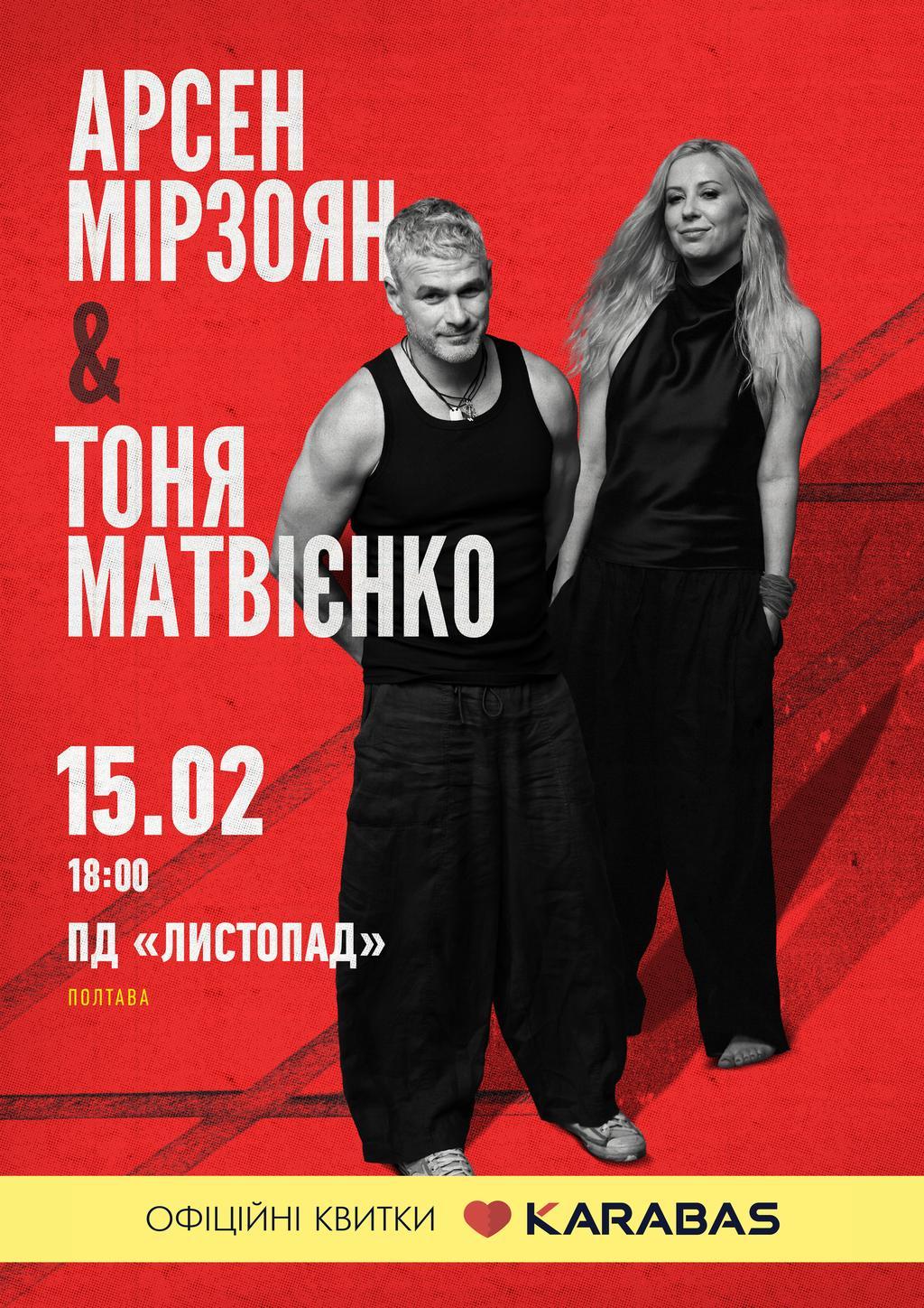 Арсен Мірзоян і Тоня Матвієнко 15 лютого з винятковим спільним концертом виступлять у Полтаві!