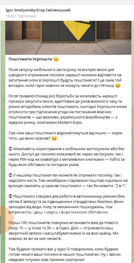 Після тривалої (понад рік) боротьби за можливість нарешті прозоро закупити якісні, адаптовані до умов воєнного часу та різних вподобань клієнтів поштомати, сьогодні Укрпошта може оголосити про підписання угоди на постачання власних поштоматів — що важливо, українського виробництва — з лідером ринку, компанією Modern Expo.