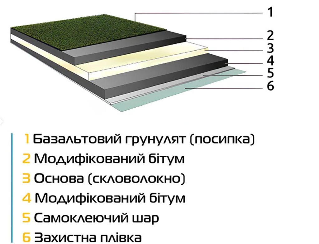 Гнучка черепиця має багатошарову структуру: захисний шар з кам'яної крихти, бітумне покриття, армуючу основу, клейкий шар та захисну плівку. Завдяки такій будові м'яка черепиця витримує температурні перепади від -50°C до +110°C, не вицвітає на сонці та служить 25-50 років залежно від виробника.