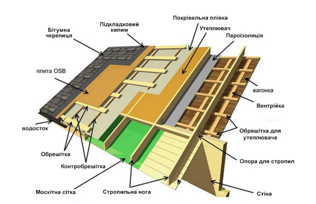 Конструкція покрівельного пирога з утепленням (знизу вгору):