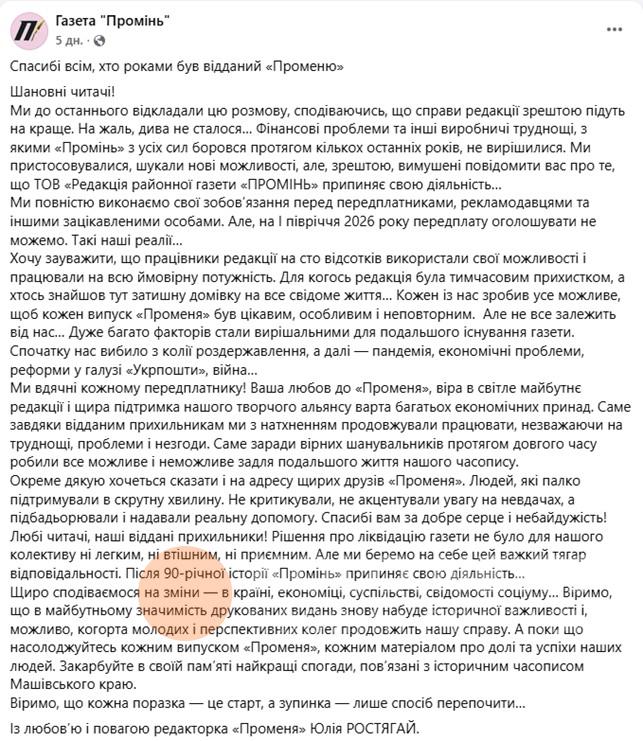 Машівська районна газета "Промінь" припиняє свою роботу. Передплату на перше півріччя 2026 року не оголошуватимуть. Про це повідомила редакторка газети Юлія Ростягай на сторінці видання у Фейсбуці: