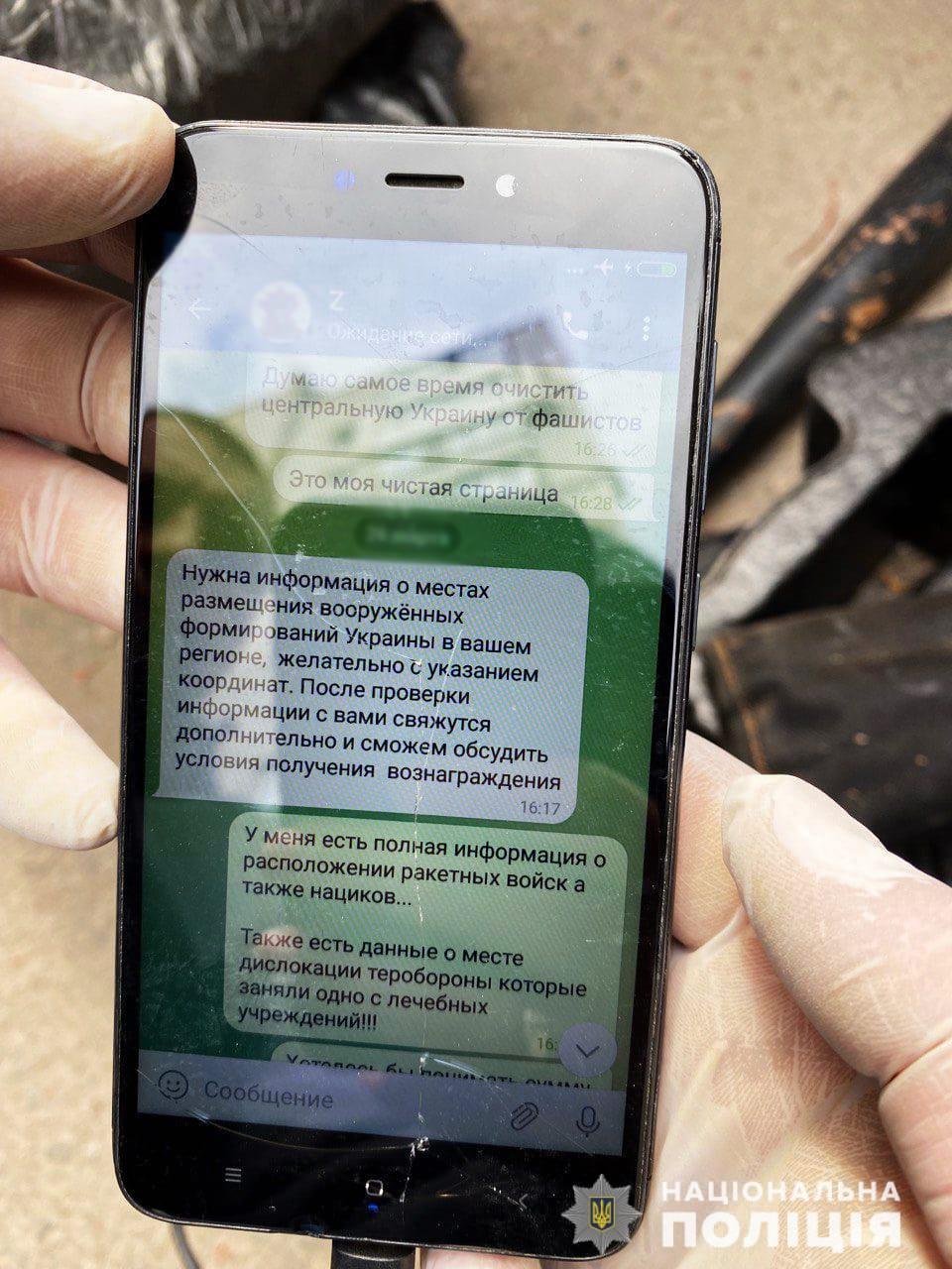 У мобільному телефоні зловмисника виявлено смс-повідомлення, в яких за грошову винагороду він обіцяє загарбникам скинути інформацію щодо місць розташування Збройних сил України.