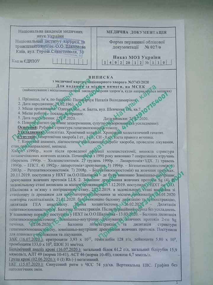 Наталії рятували життя в інституті хірургії і трансплантології імені О. О. Шалімова. Починаючи з 1993 року, тут жінці зробили 11 операцій різної складності (встановлення штучних протоків і їх дренування тощо). За цей час у жінки відривався тромб, Наталія пережила клінічну смерть.