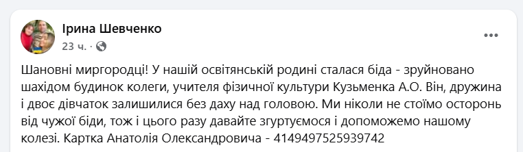 «У нашій освітянській родині сталася біда – зруйновано шахідом будинок колеги, учителя фізичної культури Кузьменка А.О. Він, дружина і двоє дівчаток залишилися без даху над головою. Ми ніколи не стоїмо осторонь від чужої біди, тож і цього разу давайте згуртуємося і допоможемо нашому колезі», – йдеться у повідомленні.