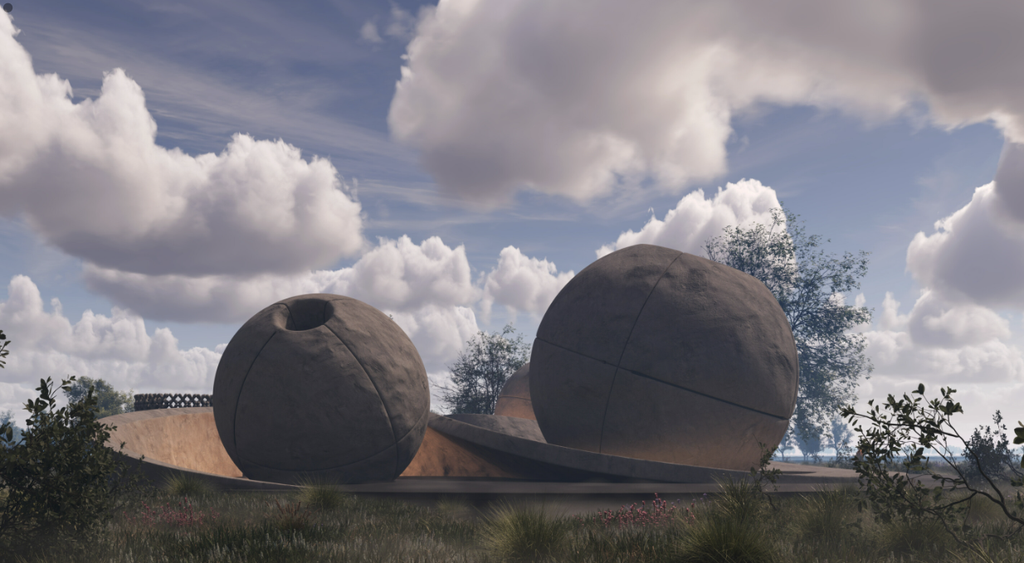 Далі можна зайти в одну з трьох сфер комплексу. Це великі похилі кулі з наскрізними отворами з глинобитних блоків – суміші необпаленої глини, соломи та піску. Ці «живі стіни» дихають, тобто поглинають надмірну вологість, дим, усілякі забруднення, віруси та мікроорганізми, екранують електромагнітні поля та радіохвилі. Вони захищають від холоду взимку і спеки влітку.