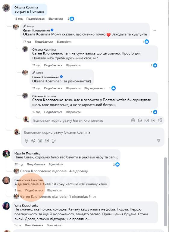 У коментарях уже традиційно розповіли, що не так із закладом. Непорозуміння викликав бограч, який точно не є полтавською стравою, ще один коментатор сказав, що їжа не смачна, а столики липкі.