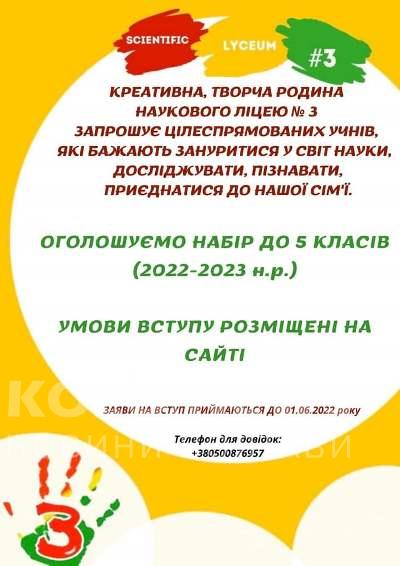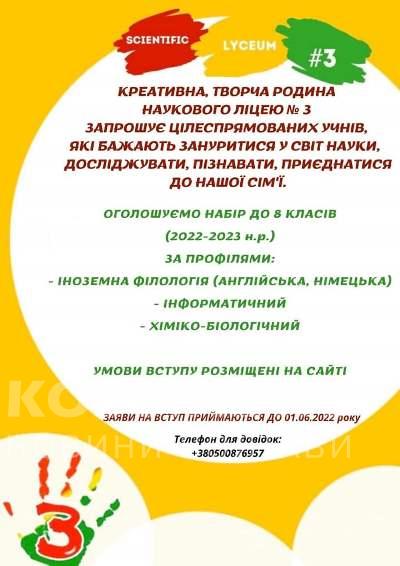 – Науковий ліцей № 3 оголошує набір до 5 та 8 класів. Запрошуємо цілеспрямованих учнів, які бажають зануритися у світ науки, прагнуть досліджувати, пізнавати, приєднатися до ліцейної родини. Ви маєте навчатися саме тут, оскільки Науковий ліцей № 3 – це якісні знання, – переконують у навчальному закладі.