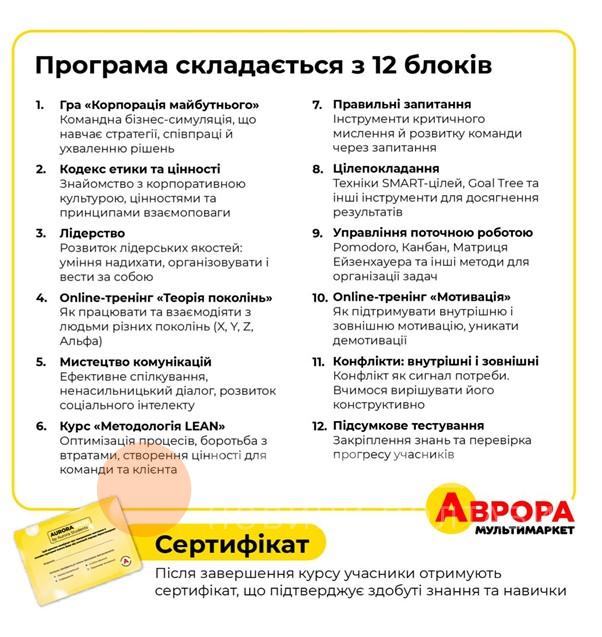«Ми прагнемо підтримувати молодь у їхньому бажанні отримувати нові знання та навички. Хочемо продемонструвати, що розвиток може бути цікавим та практичним. У школі навчають рахувати, тобто hard skills, а ми покажемо, як взаємодіяти «по-аврорівськи» з відкритістю, натхненням і повагою. Навчимо таким soft skills як лідерство, ініціативність, як побудувати свій робочий день, продемонструємо, що важливо не боятися пробувати», — зазначила Катерина Колубай, керівниця відділу з супроводу дотримання етики та цінностей мережі «Аврора».