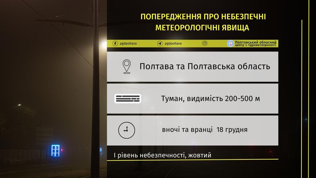Полтавський обласний центр з гідрометеорології повідомляє про туман і перший рівень небезпечності, жовтий.