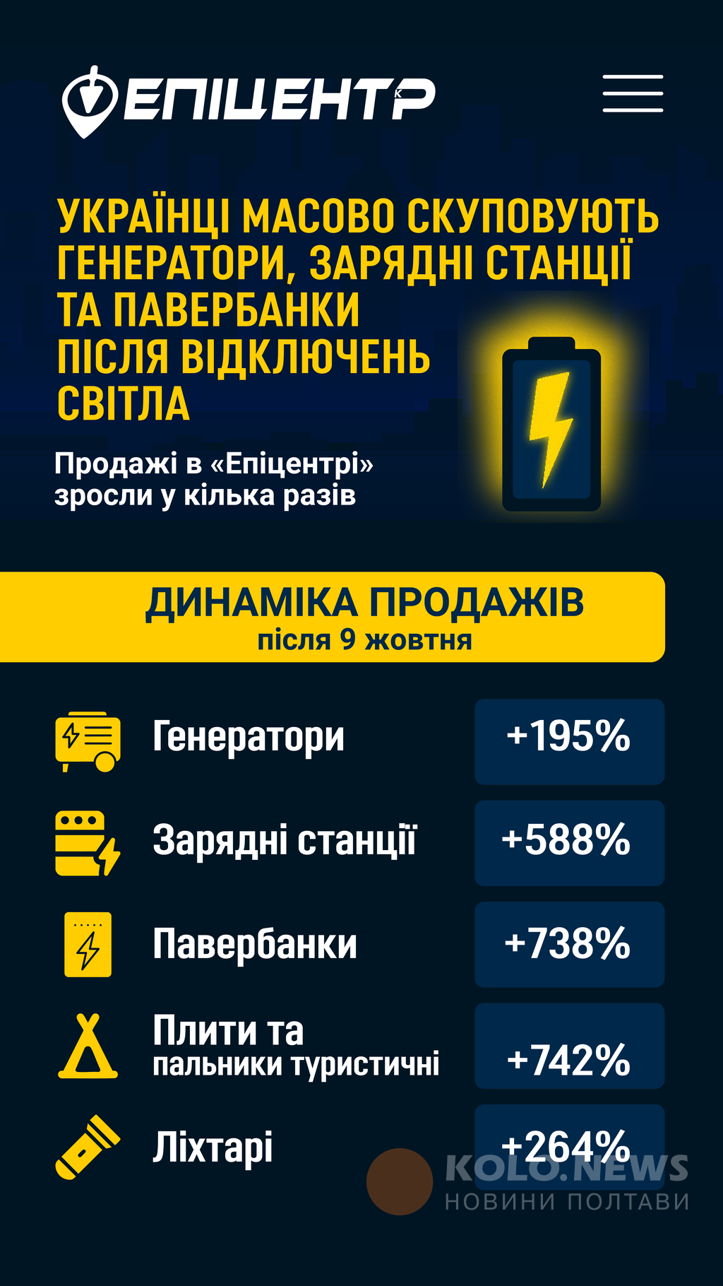 Після масованих обстрілів енергетичної інфраструктури та віялових відключень світла по Україні, мережа торговельних центрів Епіцентр зафіксувала різке зростання попиту на товари для автономного енергозабезпечення – повідомляють у департаменті зв'язків з громадськістю ТОВ "Епіцентр К".