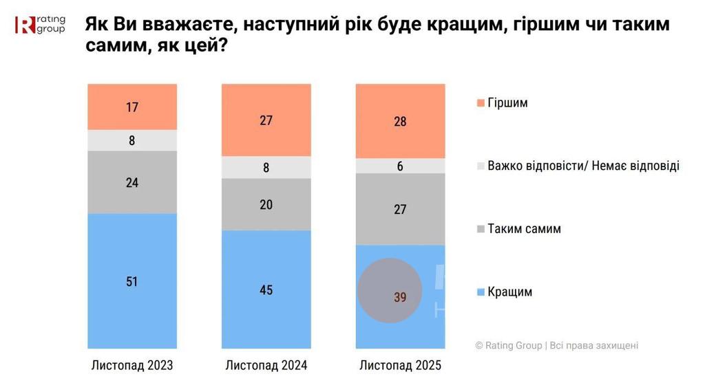За даними End of Year Survey від Rating Group для Gallup International, 27% очікують, що нічого не зміниться, а 28% — що рік буде гіршим.Оптимістичніші настрої мають жителі сіл та люди за 51 рік, тоді як найбільш песимістичні — молодші чоловіки 18–35 років.