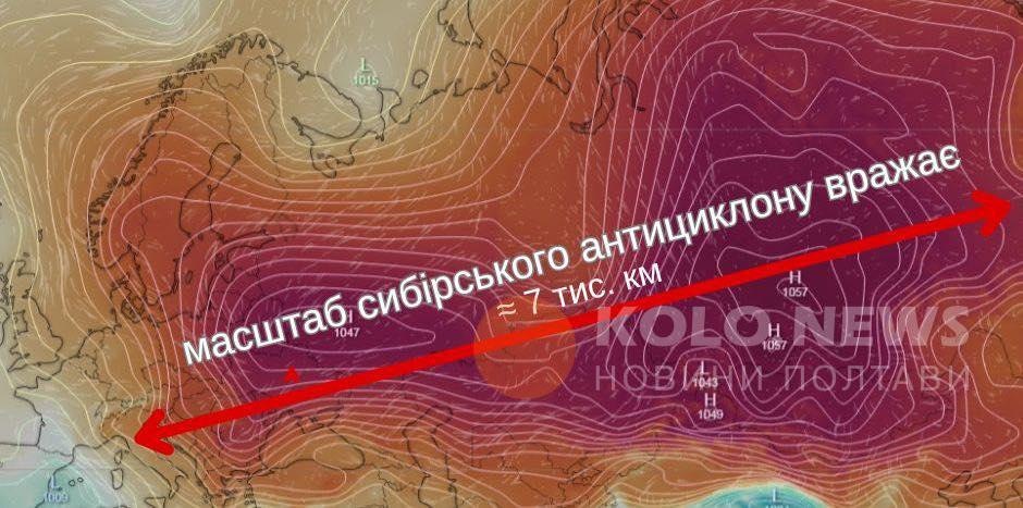 Над Євразією домінує розвинутий континентальний антициклон, який ми вже звикли називати сибірським. Для уяви його масштабів - він локалізується від Далекого Сходу аж до Афін. А це відстань близько 7 тис. км. Його роль - блокуюча стіна для теплої Атлантики і він відкрив дорогу для безперешкодних вторгнень полярного холоду.
