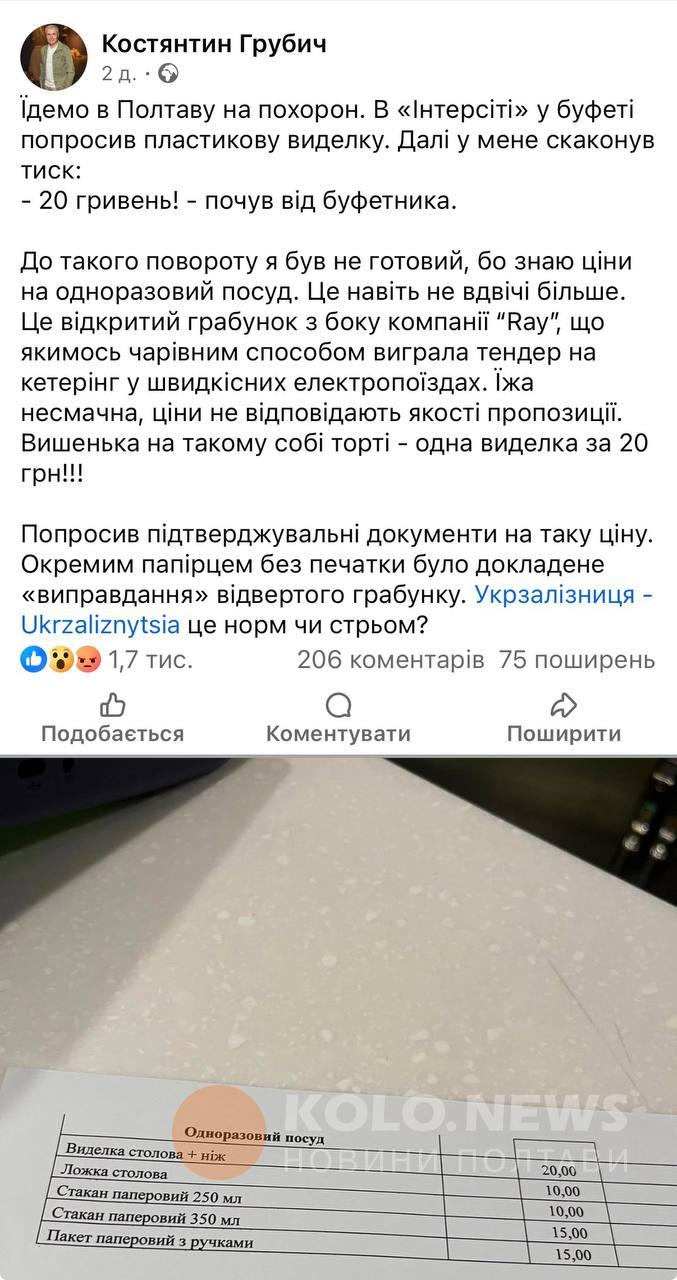 Несмачна їжа та платні столові прибори, плюс 70 гривень до замовлення за одноразові столові прибори – чеки з Інтерсіті оприлюднив на своїй сторінці у Фейсбук Костянтин Грубич. Улюблений український ведучий днями їхав Укрзалізницею у Полтаву. У буфеті він попросив пластикову виделку і почув у відповідь – 20 гривень!
