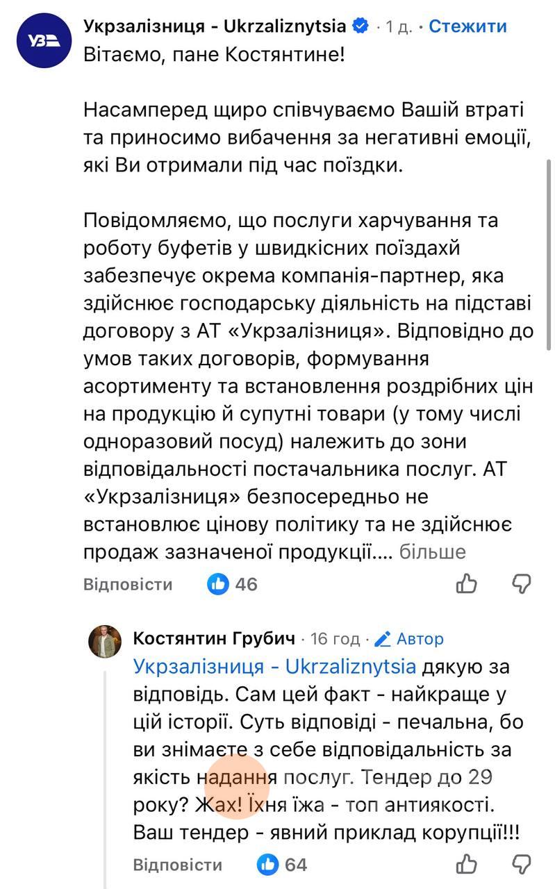 Костянтин Грубич у коментарі Укрзалізниці відповів, що суть відповіді - печальна, бо, на його думку, Укрзалізниця знімає з себе відповідальність за якість надання послуг: