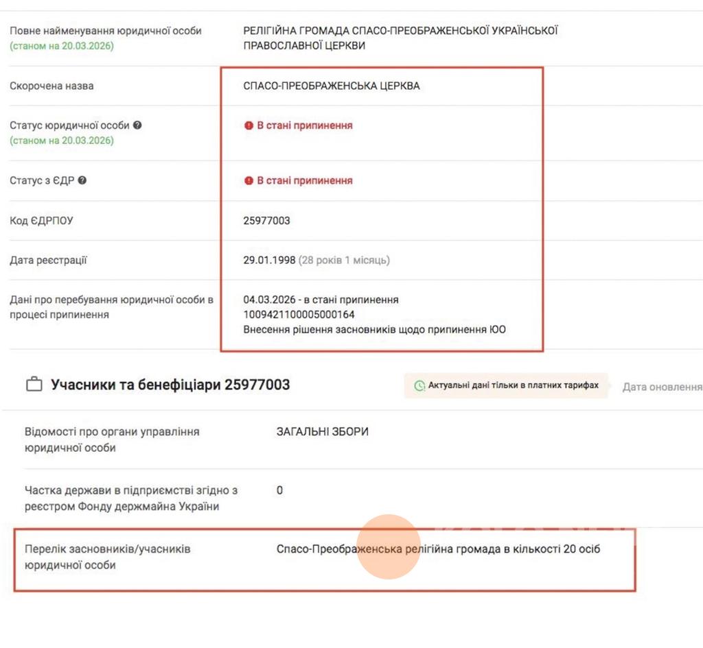 Дійсно, якщо поглянути на відкриті реєстри юридичних осіб і фізичних осіб підприємців бачимо, що юридична особа – Спасо-Преображенська церква з 4 березня 2026 року знаходиться в статусі припинення. Про це мається відповідний запис. Своєю чергою, засновником організації зазначена Спасо-Преображенська релігійна громада в кількості 20 осіб. Про фіксоване членство, наразі, мова не йде. Таким чином, можна зробити висновок, що не так давно мали б відбутися протокольні збори релігійної громади, на яких було прийнято рішення про її фактичну ліквідацію.