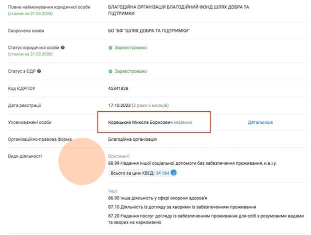 З декларації пана Корецького ми дізналися, що він є співзасновником ще одного благодійного фонду з промовистою назвою “Подарована Надія”. Зареєстрована чергова благодійна організація була в листопаді 2023 року, а її керівником зазначена Коваленко Тетяна Михайлівна. За дивним збігом обставин усі три благодійні фонди, про які ми згадували в нашому розслідуванні, “народилися” практично одночасно, в жовтні-листопаді 2023 року. Мета їх появи схоже очевидна –перереєстрація нерухомого майна, яке б мало належати релігійним громадам.
