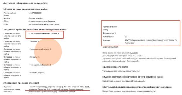 Без проведення аукціону електронних торгів, земельну ділянку в оренду можна взяти лише в тому випадку, якщо на ній розташовується ваша нерухомість. Виникає логічне запитання: невже приміщення будівлі Спасо-Преображенської церкви належить не релігійній громаді а благодійному фонду депутата? Відповідь ми знайшли в Державному реєстрі речових прав на нерухоме майно.