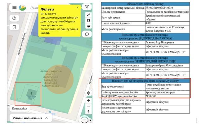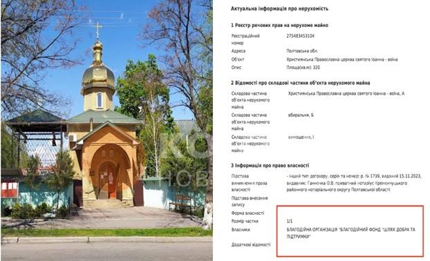 Додатково, нашу увагу привернув той факт, що згідно інформації з Державного реєстру речових прав на нерухоме майно за благодійним фондом Миколи Корецького, окрім Спасо-Преображенської церкви зареєстрована ще одна будівля. Замовивши витяг ми побачили, що мова про ще одну культову споруду – Християнську Православну церкву святого Іоанна-воїна. Йдеться про церкву, яка фактично розташувалася на території Кременчуцького ліцею з посиленою військово-фізичною підготовкою ім. Героя України Віталія Коваля, який підпорядкований Полтавській обласній раді.