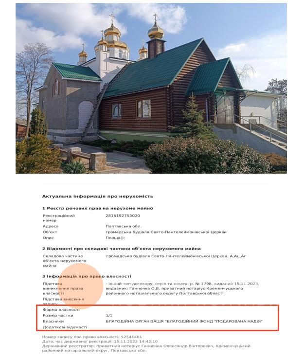 Повертаючись до “Подарованої Надії”, де депутат облради Корецький зазначений співзасновником, та переглядаючи Державний реєстр речових прав на нерухоме майно, бачимо, що цій сумнівній благодійній організації на праві власності належить ще одна культова споруда в Кременчуці – будівля Свято-Пантелеймонівської Церкви. Вона розташована в мікрорайоні Перший занасип на вул. Велика Набережна.