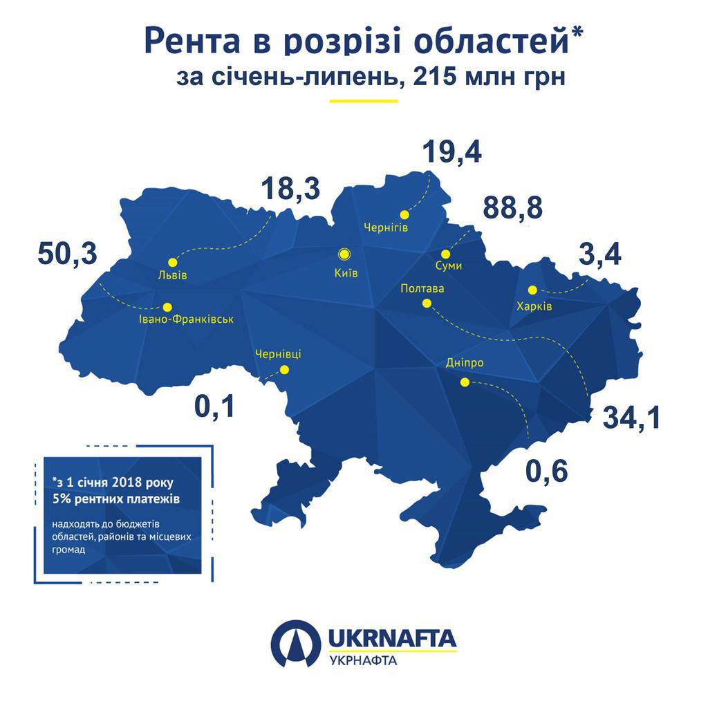 З них 215 млн грн спрямували до місцевих бюджетів відповідно до закріпленого в законодавстві механізму розподілу рентної плати за видобуток нафти і газу. Найбільші надходження з рентної плати «Укрнафти» отримають бюджети Сумської, Івано-Франківської та Полтавської областей.