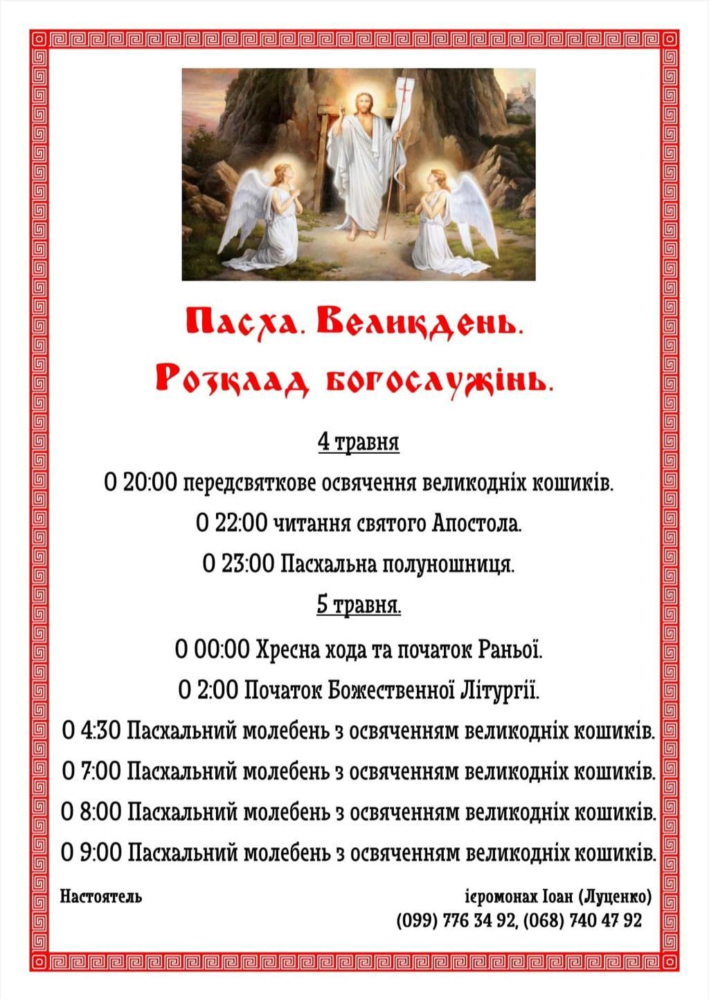 Неділя: з опівночі розпочинається святкове Пасхальне Богослужіння. По закінчені якого освячення пасок (орієнтовно з 4.00 до 12.00)