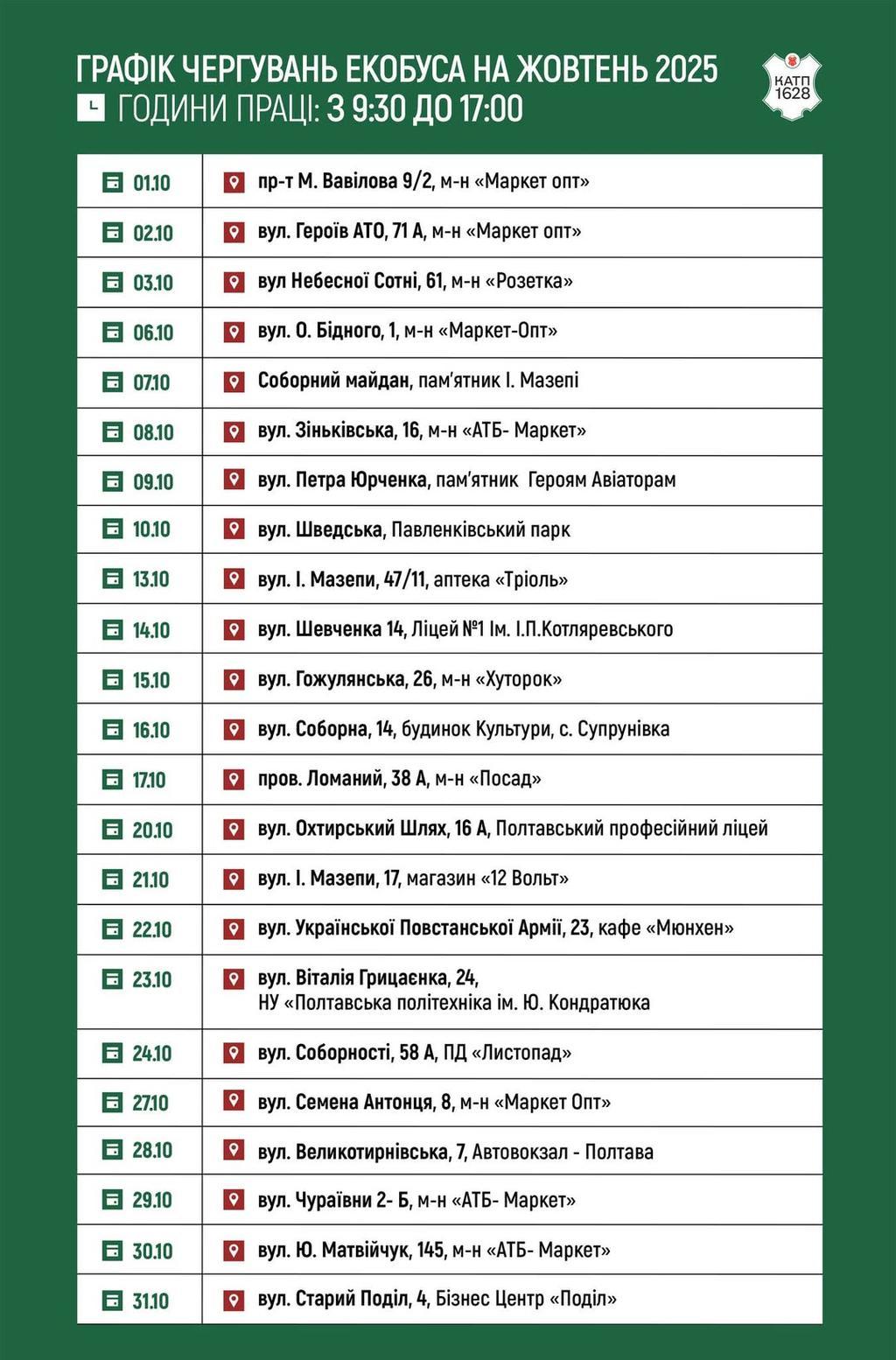 Графік чергувань екобуса у Полтаві на жовтень
