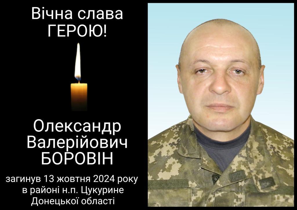 Стрілець-санітар Олександр Боровін загинув 13 жовтня 2024 року від отриманих травм внаслідок обстрілу в районі населеного пункту Цукурине Донецької області, відданий військовій присязі на вірність Українському народу, мужньо виконував військовий обов’язок, в бою за Україну, її свободу і незалежність. Повернутий воїн лише зараз відповідно до порядку передачі та репатріації тіл загиблих.