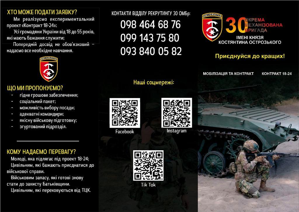 30 окрема механізована бригада запрошує громадян України на військову службу за контрактом. Це можливість стати частиною бойового, згуртованого колективу, який з честю виконує завдання із захисту Батьківщини.