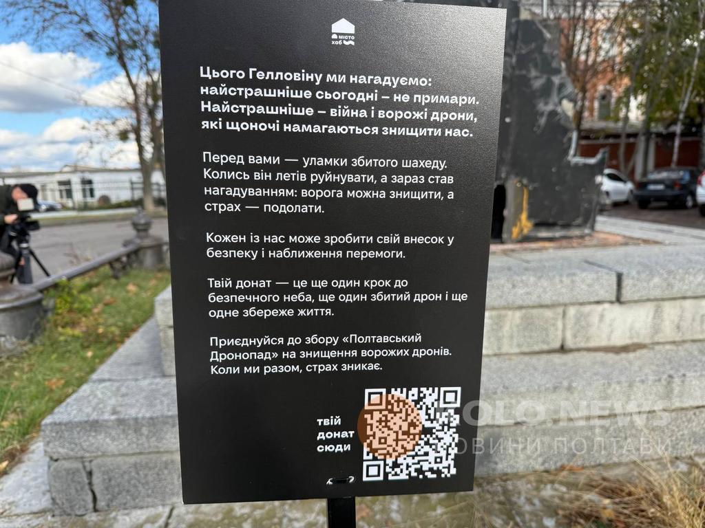 Дрон для інсталяції передав фонд «Повернись живим». В такий спосіб хочуть привернути увагу до збору коштів на «Полтавський дронопад» - збір на три мільйони, щоб посилити захист неба та знищувати ворожі дрони, які несуть загрозу нашим містам, домівкам і людям.