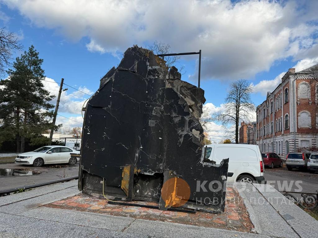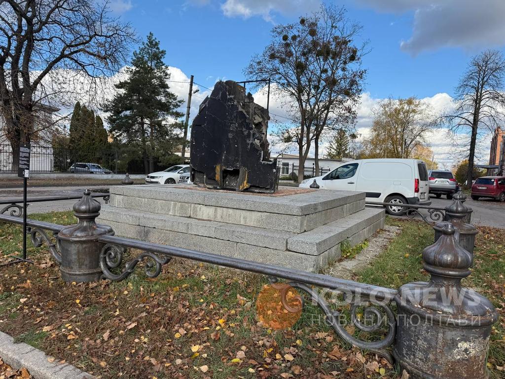 Сьогодні, 31 жовтня, у Полтаві на залишках постаменту пам’ятника на місці відпочинку Петра І встановили нову інсталяцію – уламок російського шахеда. Ініціатива належить команді «Містохабу», про це розповіла Альона Гончаренко, його співзасновниця.