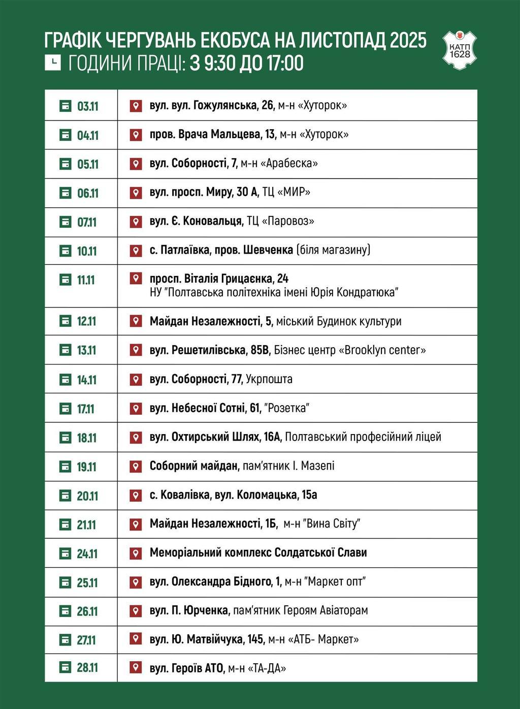 Зберігайте графік чергування екобуса в Полтаві на листопад 2025 року. Його опублікували на КАТП-1628.