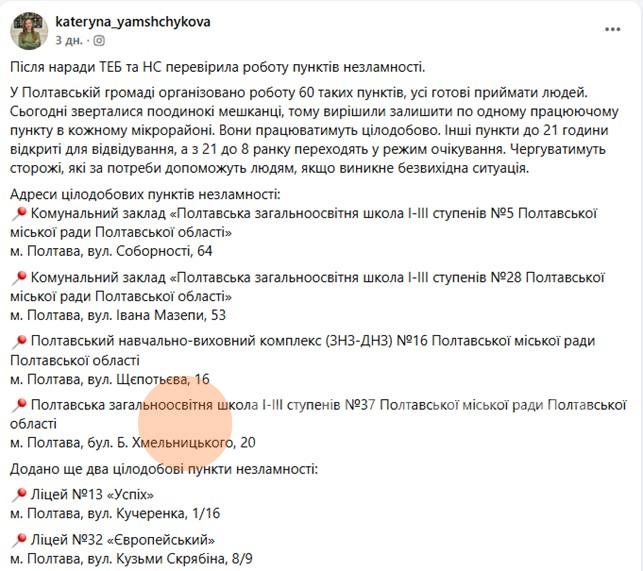 У Полтавській громаді пунків незламності 60. Усі готові приймати людей – повідомила Катерина Ямщикова. Серед них є і цілодобові.