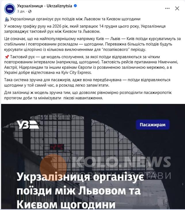 Укрзалізниця організує рух поїздів між Львовом та Києвом щогодини - повідомляє Укрзалізниця. У новому графіку руху на 2026 рік, який запрацює 14 грудня цього року, Укрзалізниця запроваджує тактовий рух між Києвом та Львовом.