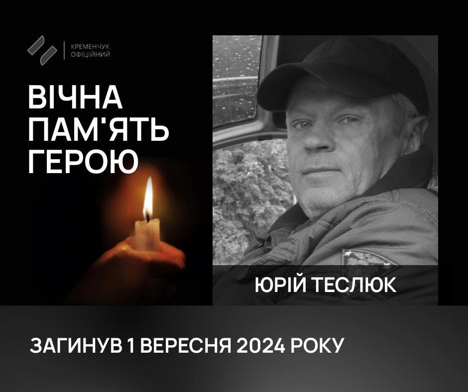 Загинув Юрій Теслюк 1 вересня 2024 року на Донеччині, виконуючи бойове завдання по захисту України, її суверенності та територіальної цілісності, відданий Військовій присязі та Українському народові.