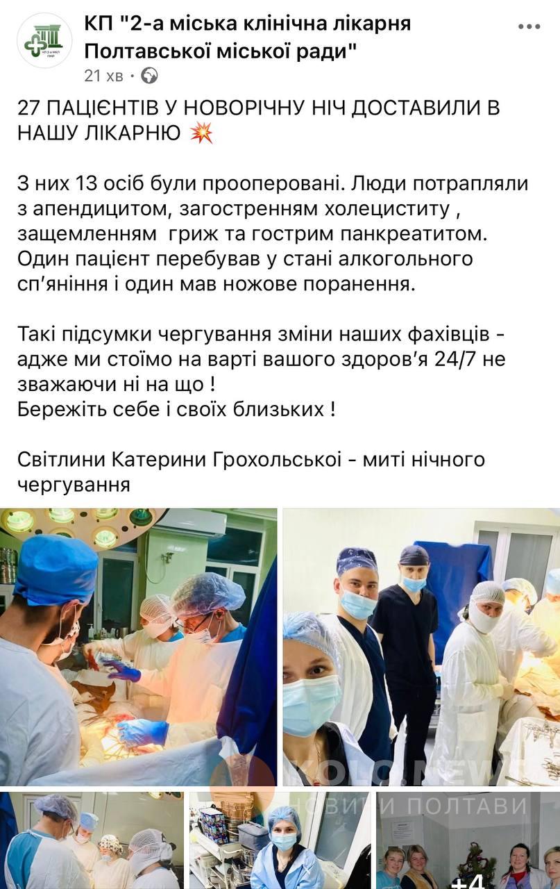 2 міська клінічна лікарня Полтави відзвітувала про новорічне чергування. 27 пацієнтів звернулись до лікарів по допомогу, 13 було прооперовано – повідомляють на офіційній сторінці лікарні:
