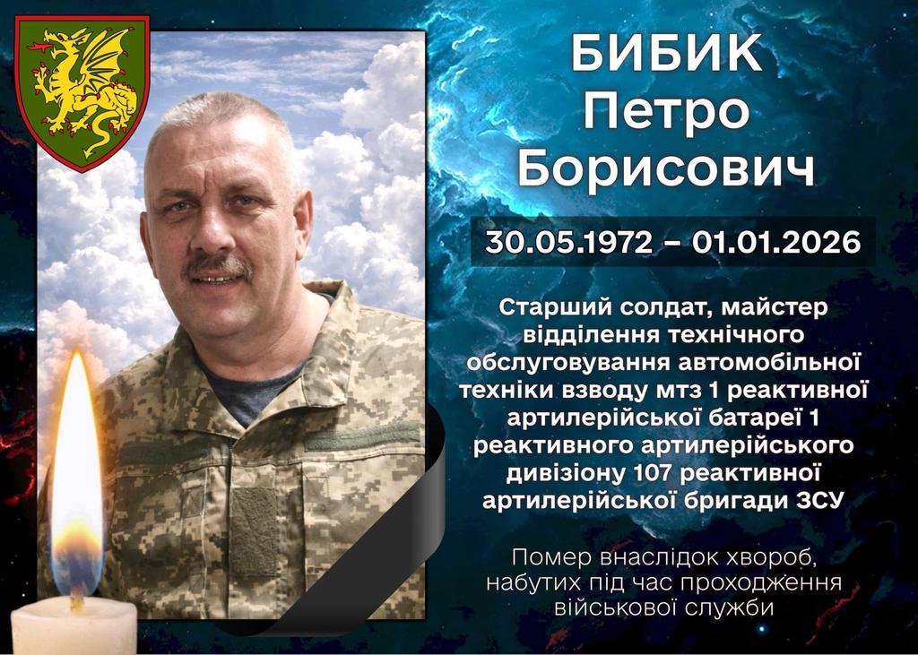 1 січня 2026 року внаслідок хвороб, набутих під час проходження військової служби, відійшов у вічність Бибик Петро Борисович – старший солдат, майстер відділення технічного обслуговування автомобільної техніки 107 реактивної артилерійської бригади Збройних Сил України.