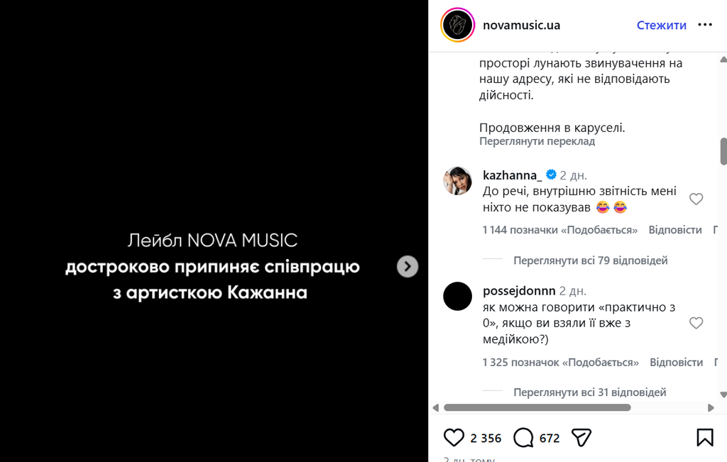 У Nova Music повідомили, що співпраця з полтавською артисткою Анною Макієнко (псевдонім Кажанна) розпочалася у жовтні 2023 року з релізу пісні «Ти гірка» і здійснювалася в межах укладених на той момент договорів. Наприкінці осені 2025 року сторони дійшли висновку, що чинні умови більше не задовольняють обидві сторони, після чого розпочали переговори щодо подальших кроків.