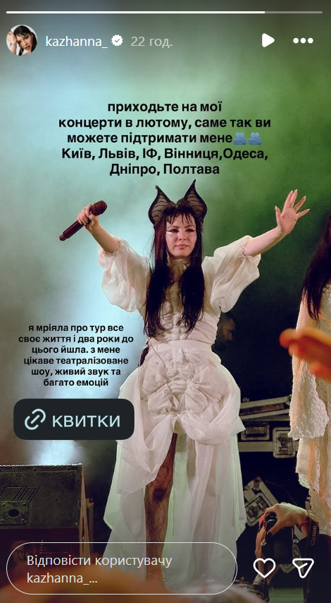 Нагадаємо, що днями в своєму Instagram співачка заявила, що більше не має бажання вести публічну діяльність та писати музику. Проте, усі концерти великого туру містами України не скасували. А Кажанна закликала підписників приходити на її концерти і в такий спосіб підтримувати.