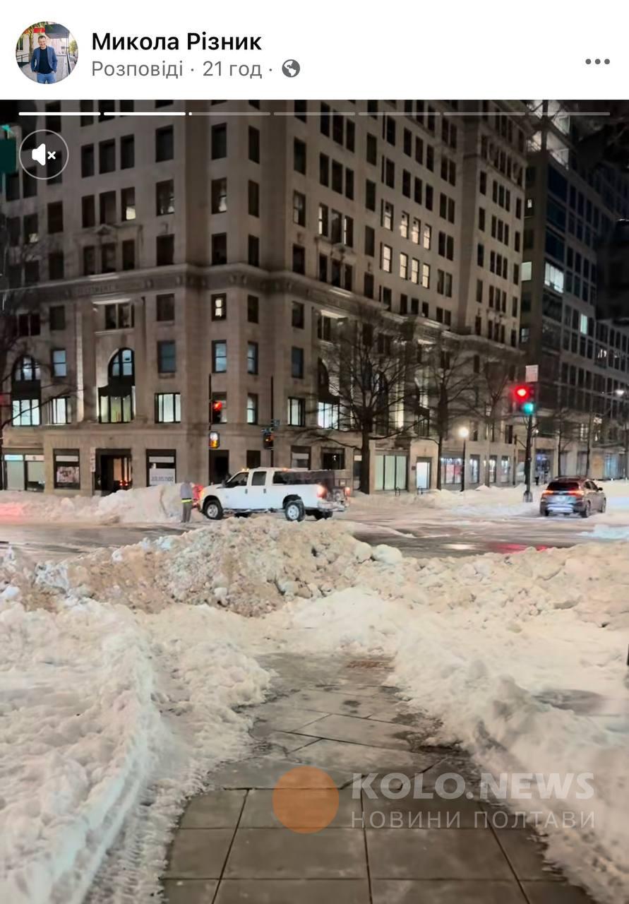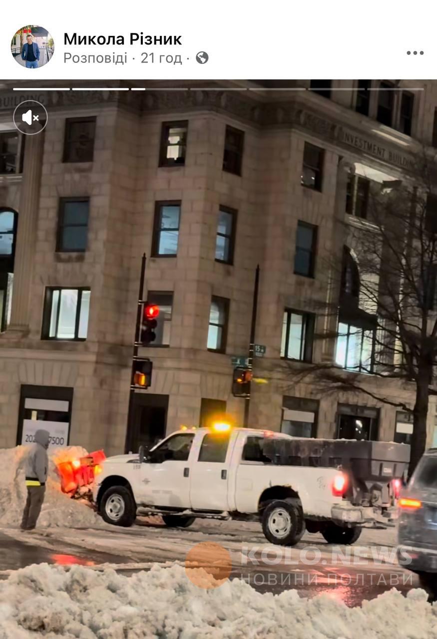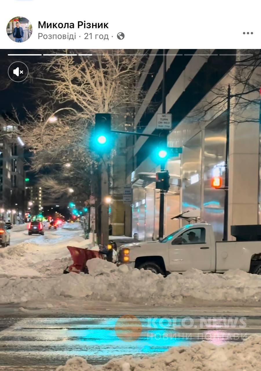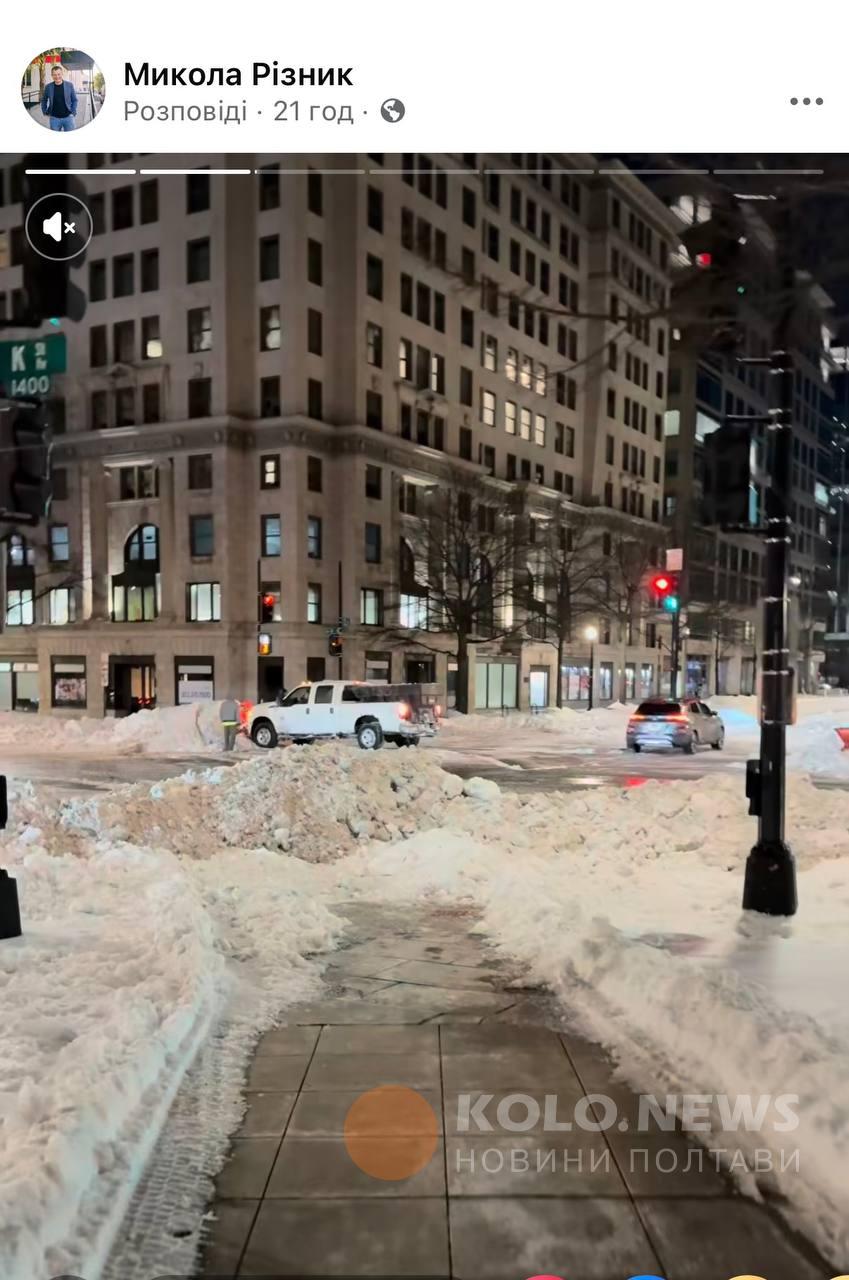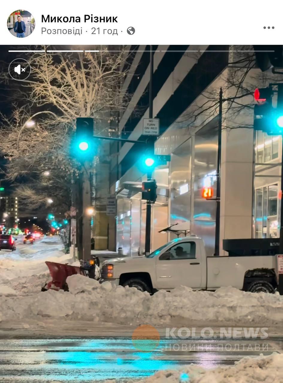 Не лише у Полтаві сьогодні природний колапс, а й у Вашингтоні. Про це ми дізнаємось з відео Миколи Різника, селищного голови Опішні, який перебуває з офіційним візитом у столиці США. У сторіз він показує комунальну техніку Вашингтону та стан чистки доріг та тротуарів. З цікавого: у США також асфальтують дороги узимку і під снігом.