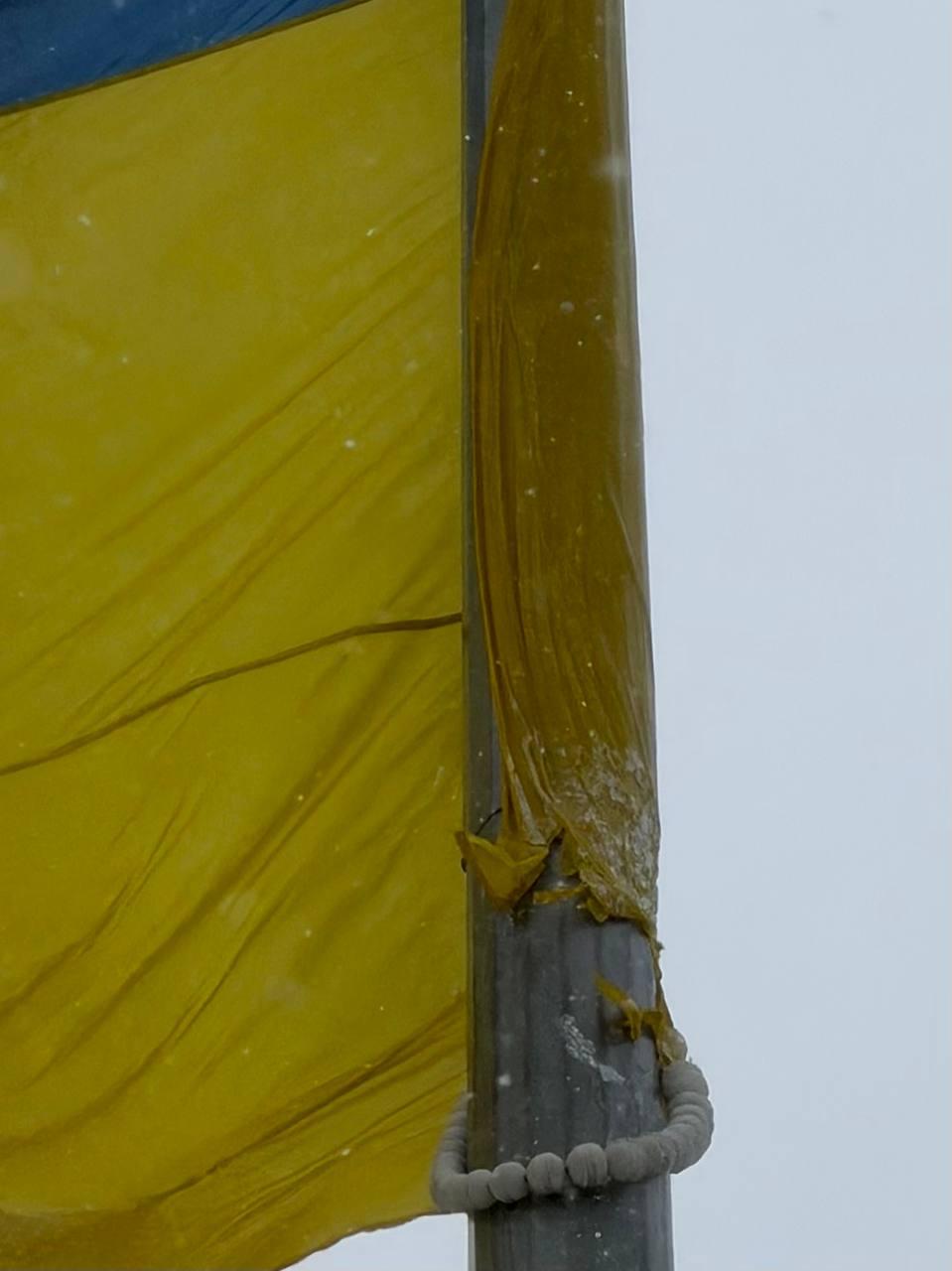 Через складні погодні умови полотно прапора щільно обмоталося навколо щогли, примерзло та не піддалося відкріпленню. Зняти прапор спробують повторно щойно погодні умови дозволятимуть.