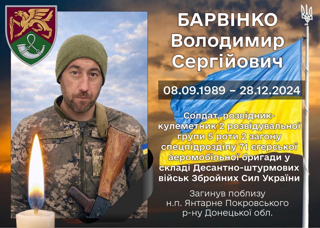 Хорольська громада отримала ще одне гірке сповіщення про загибель земляка, мешканця села Княжа Лука Староаврамівського старостинського округу – Володимира Сергійовича Барвінка.