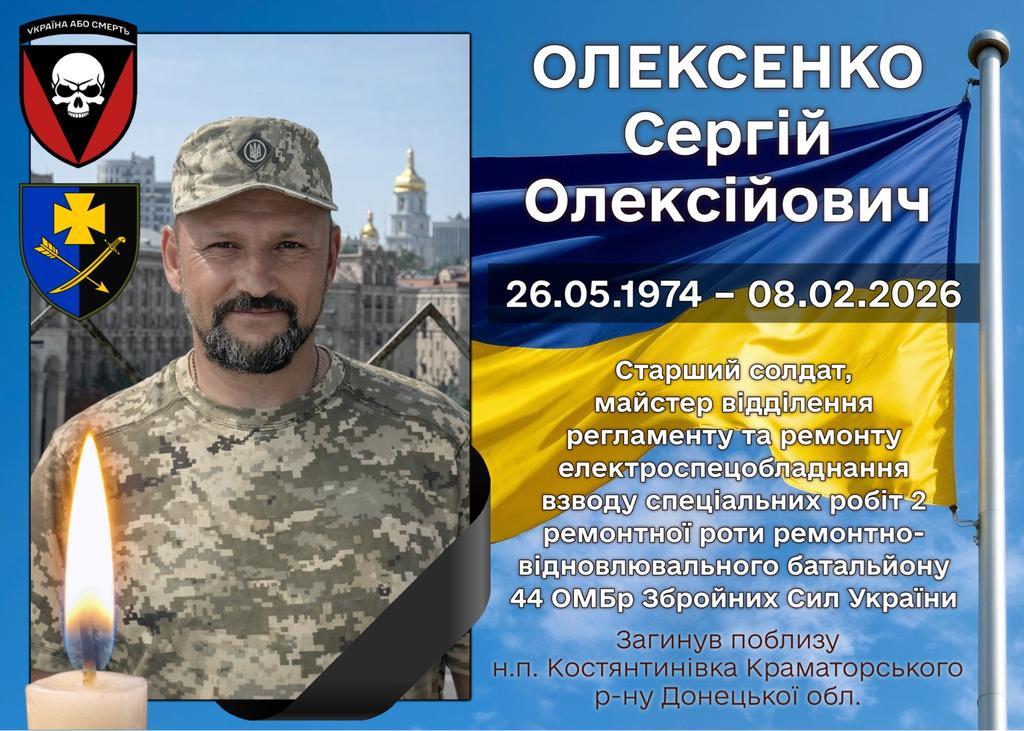 Старший солдат, майстер відділення регламенту та ремонту електроспецобладнання взводу спеціальних робіт 2 ремонтної роти ремонтно-відновлювального батальйону 44 окремої механізованої бригади загинув 8 лютого 2026 року поблизу н.п. Костянтинівка Краматорського р-ну Донецької області, внаслідок артилерійського ворожого обстрілу.