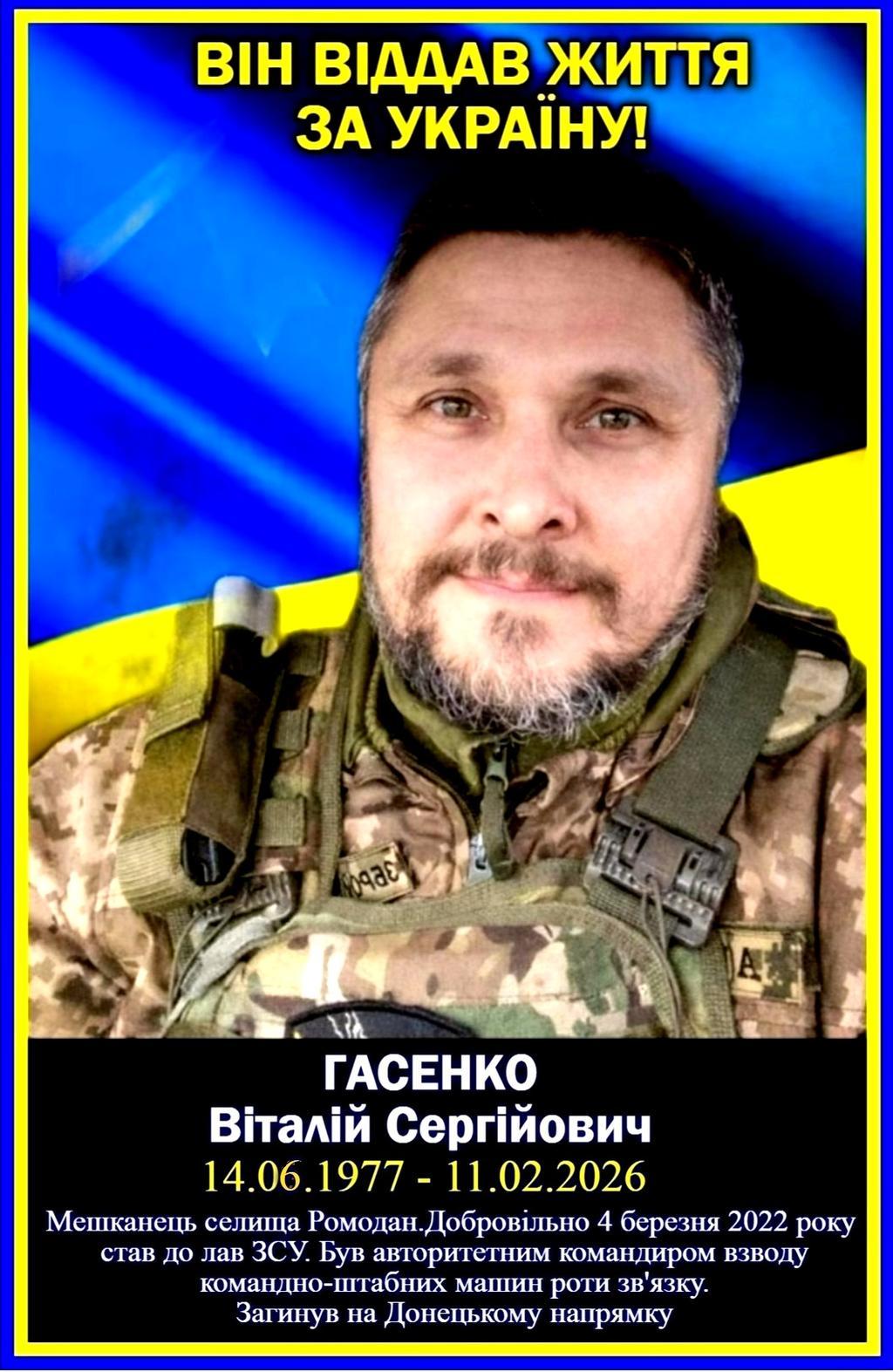 18 лютого, у Ромоданівській громаді провели в останню путь земляка, мужнього Захисника, головного сержанта Гасенка Віталія Сергійовича (14.06.1977 – 11.02.2026).