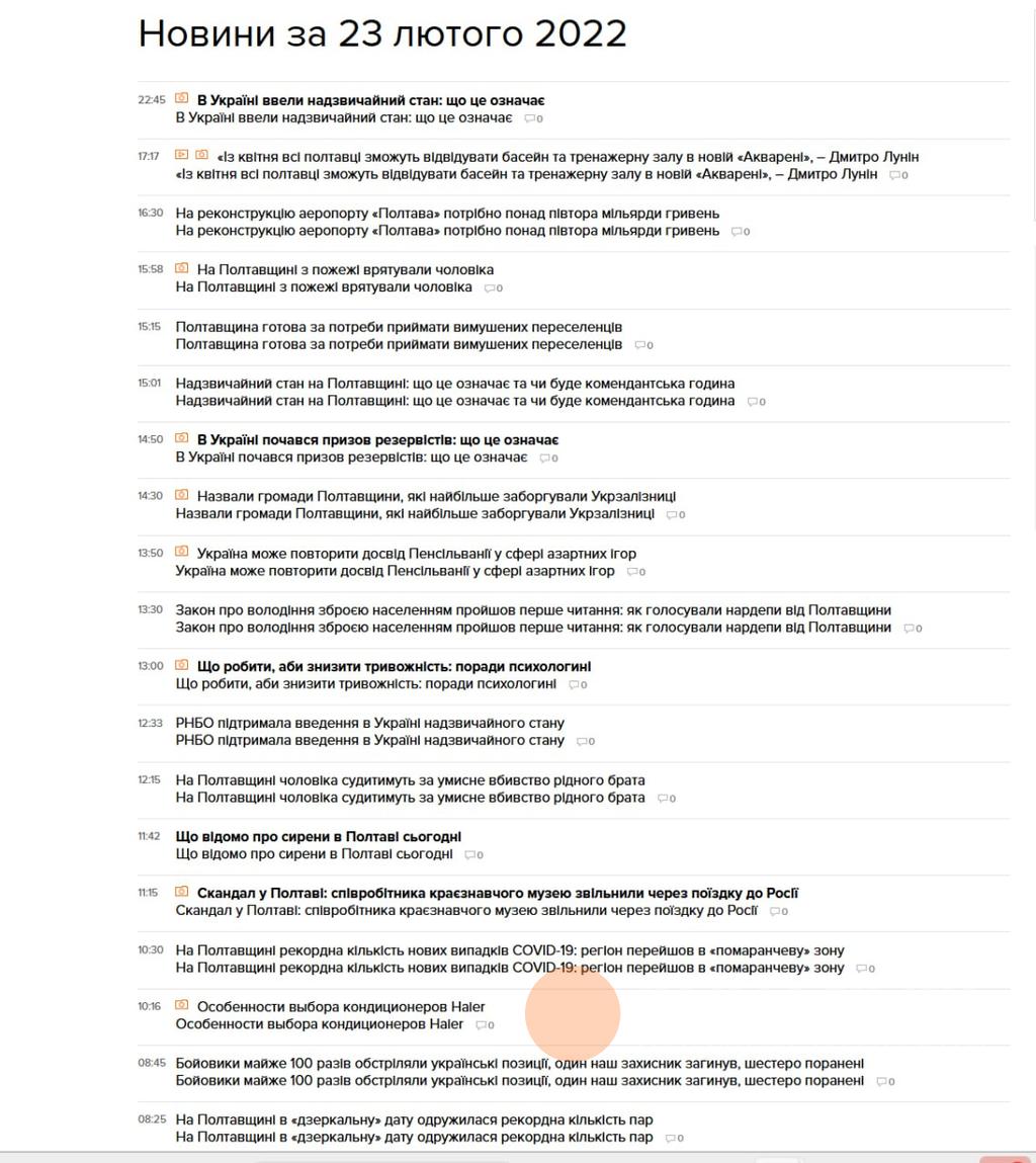 Стрічка новин 23 лютого - уже дуже тривожна, але ще з надією на мир і навіть з рекламою російською мовою. У стрічці новин 24 лютого видно шок від того, що старого життя уже не буде і намагання вижити у новій реальності.