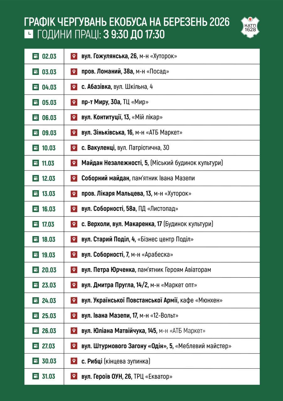 КАТП-1628 опублікували графік чергування екобуса в Полтаві на березень 2026 року.