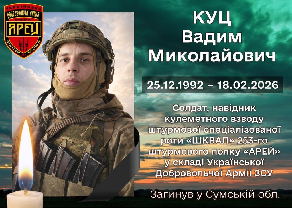 18 лютого 2026 року на Сумщині, внаслідок ворожої атаки FPV-дроном, загинув уродженець села Вишняки Хорольської громади – Вадим Миколайович Куц.