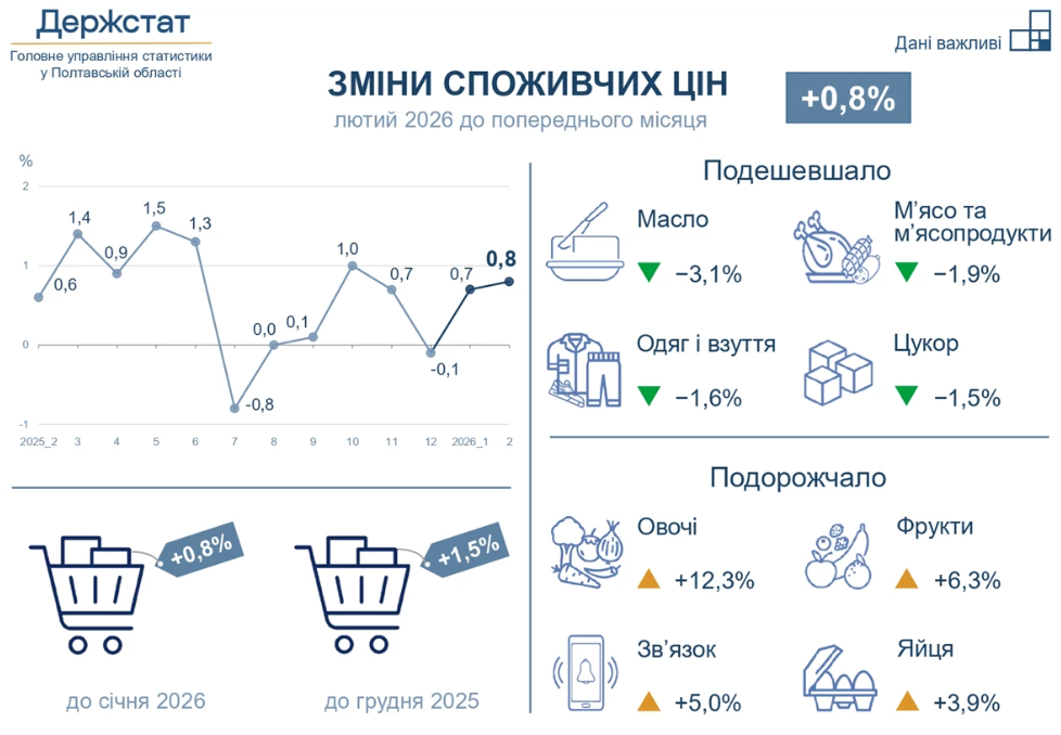 Ціни на споживчому ринку Полтавщини в лютому 2026 року порівняно з попереднім місяцем по області зросли на 0,8%, з початку року – на 1,5% (по Україні – на 1,0% та 1,7% відповідно). Про це повідомили в Полтавській ОВА.