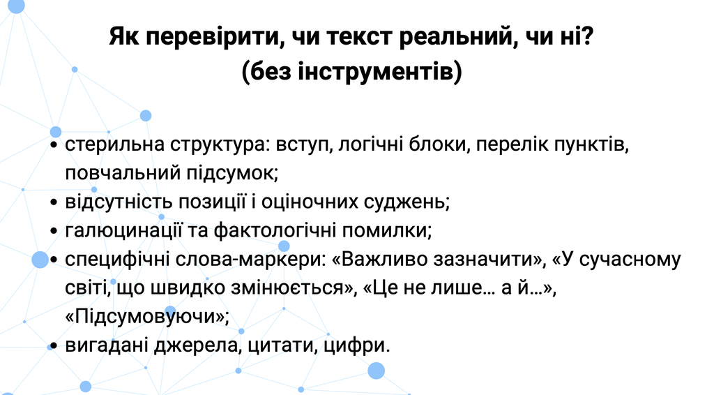А коли мова йде про тексти, то й поготів. ШІ-контент часто має «стерильну» структуру, однаковий ритм речень, відсутність чіткої позиції або містить вигадані джерела, уточнює експертка. Детектори ж аналізують не зміст написаного, а математичну ймовірність тексту — наскільки він передбачуваний. Тож це лише свідчить про те, що автоматична перевірка не замінює людського аналізу. І про це варто пам’ятати як журналістам і редакторам, так і читачам та глядачам.